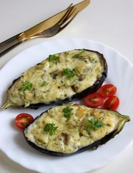 Далее баклажанные лодочки наполните подготовленной начинкой и поместите запекаться в духовку в течение 40 минут при температуре 180 градусов.