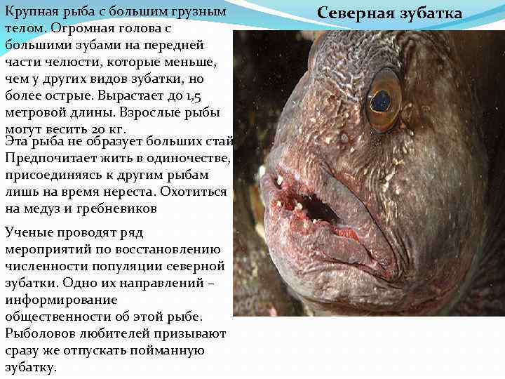 Это очень большая рыба, напоминающая мурен, хотя родственницей последних зубатка не является. Она относится к семейству окунеобразных, обитает в холодных водах северных морей. Название прекрасно отражает внешние особенности – первое, на что обращаешь внимание при виде зубатки, так это ее торчащие клыки, которые видны даже снаружи пасти. Челюсть помогает рыбе охотиться даже на добычу, которая крупнее, а также порой спасает зубатку от рыбаков, поскольку мощной челюстью она способна перекусить даже рыболовный багор или черенок лопаты.