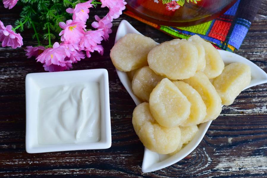 - Ленивые вареники (ленивые пельмени со свежим сыром) готовы! Приправить их небольшим количеством масла и сервировать сметаной в качестве соуса: Ленивые вареники (ленивые пельмени со свежим сыром)