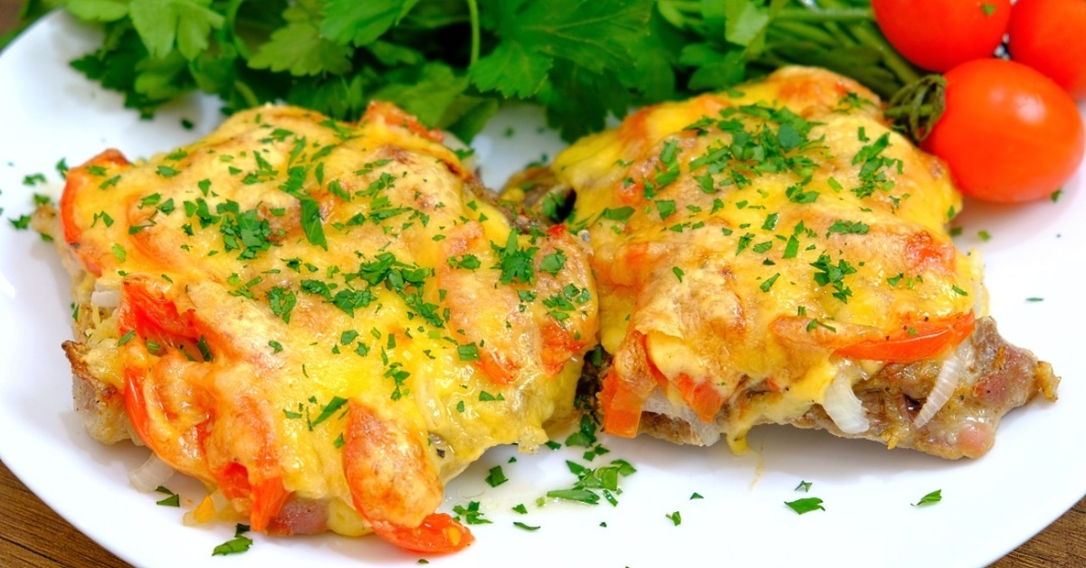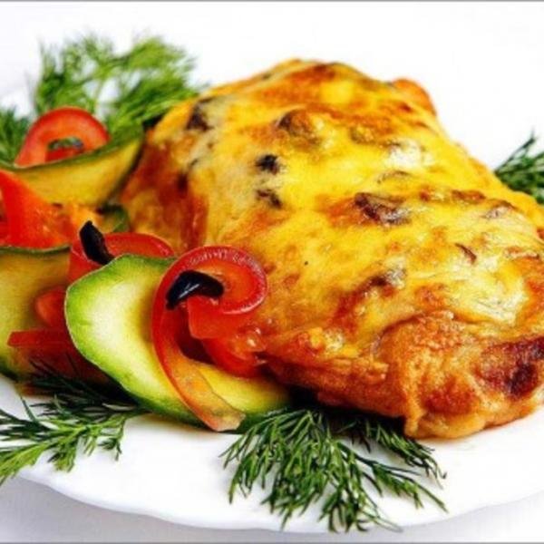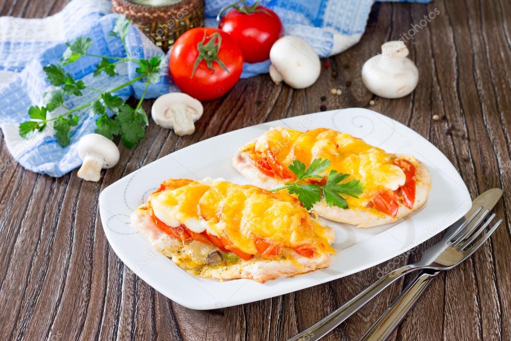 Запеченная куриная грудка с грибами и помидорами под сырной корочкой