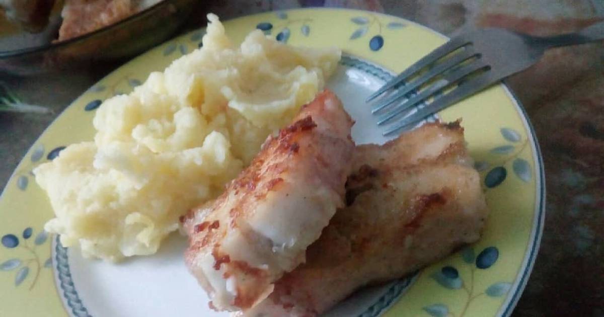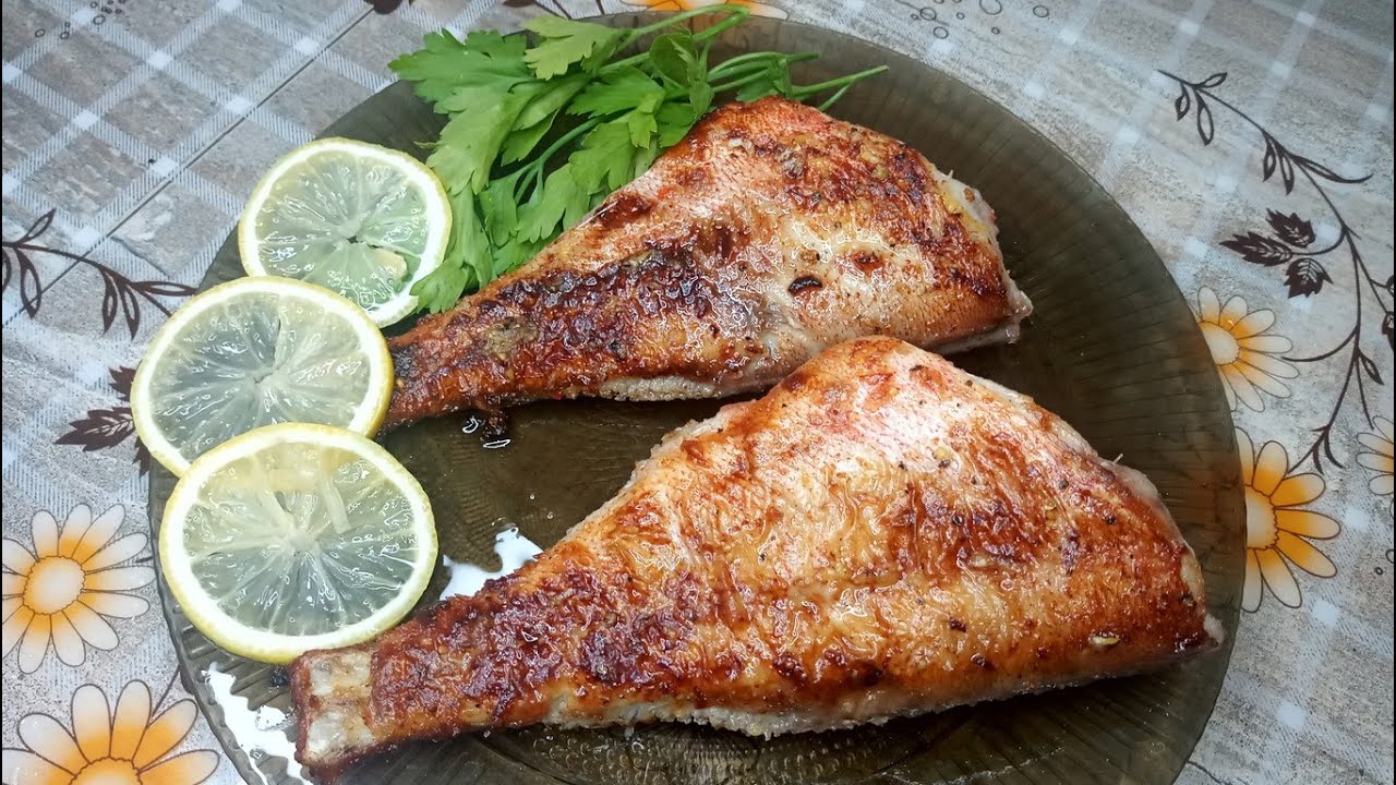 Вкусный, нежный и ароматный морской окунь, жареный на сковороде с луком.